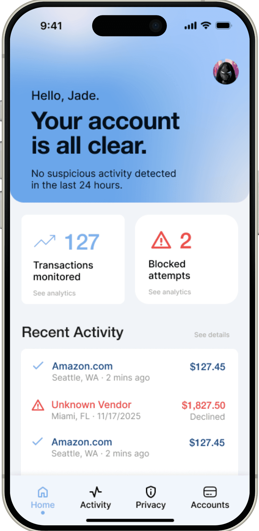 移动端 App,在购买完成后持续监控交易动态,及时提醒未授权扣款、数据泄露及账户异常。